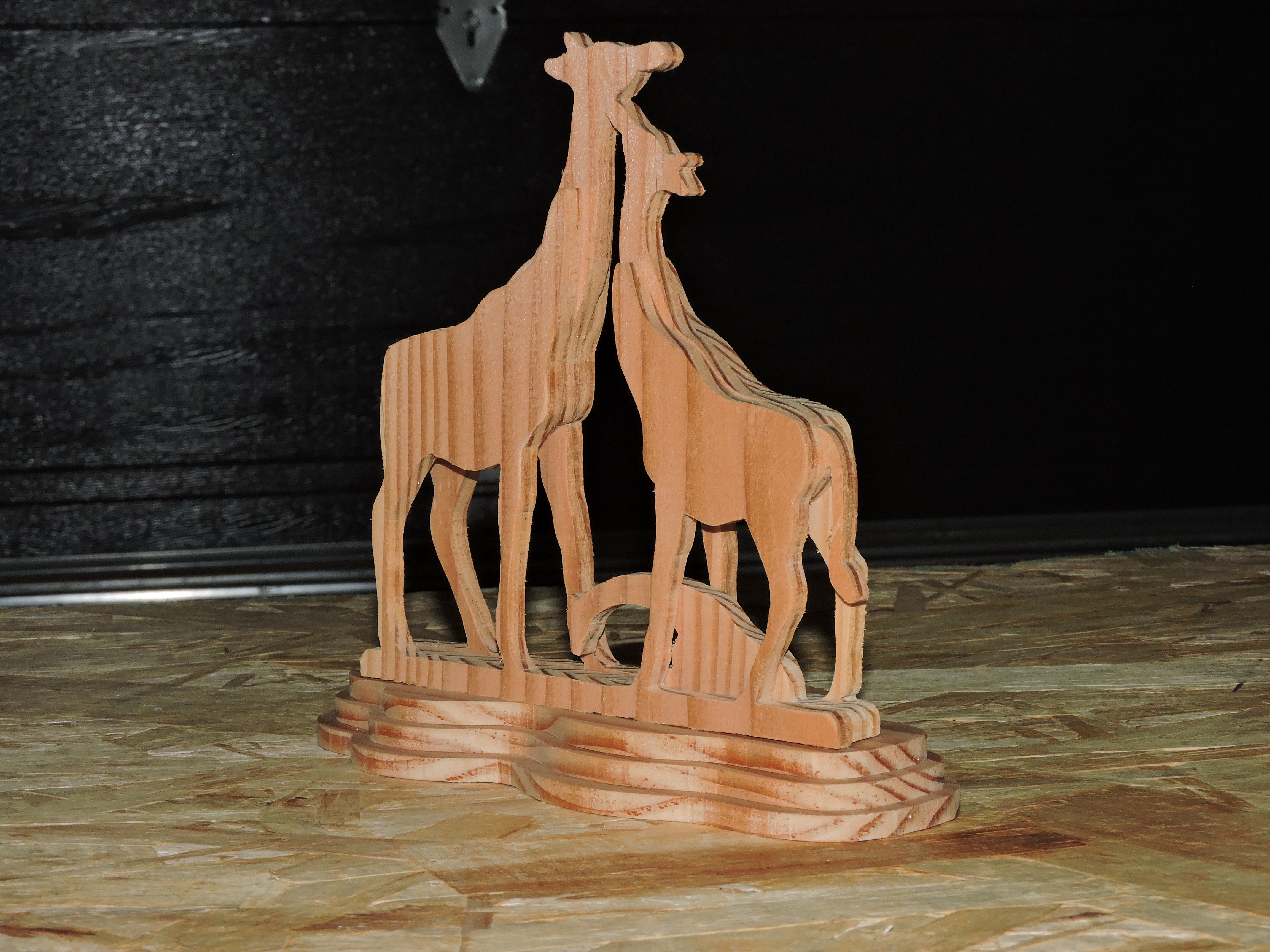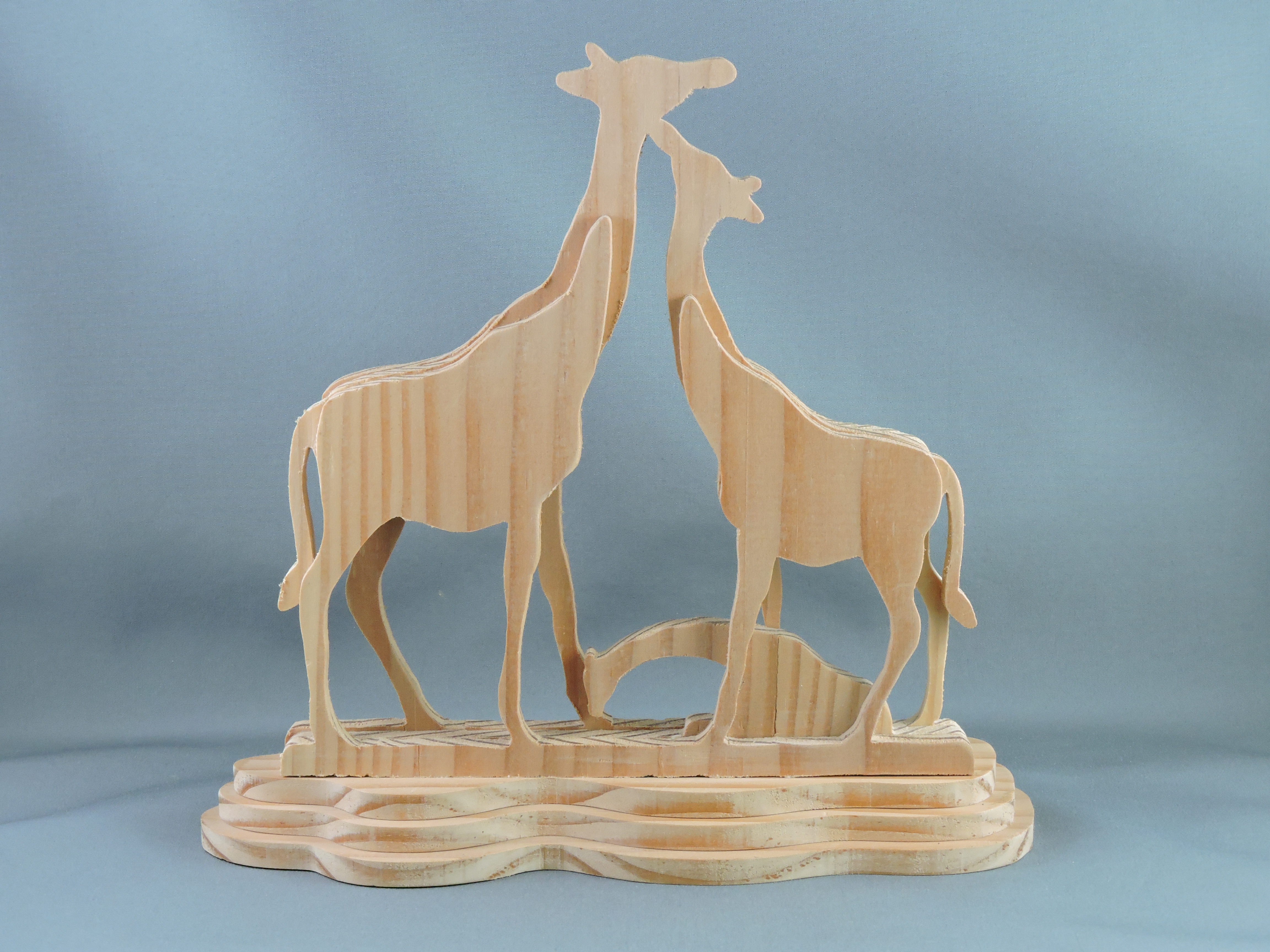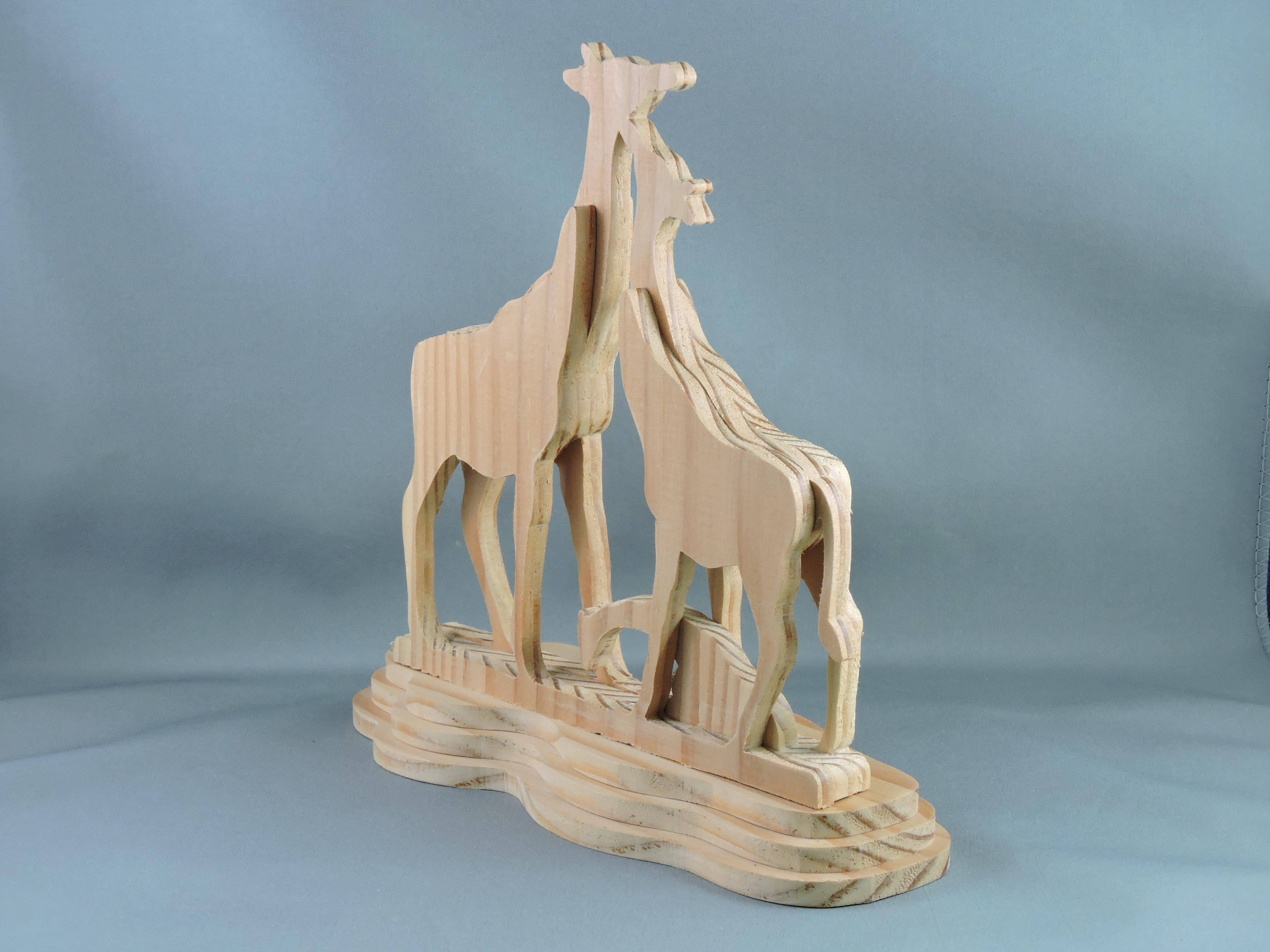 Carving consists of three giraffe figures. The adult male giraffe stands on the right, with a tall, slender neck and a slightly broader body compared to the others. The adult female giraffe is positioned on the left, with a similarly tall neck but a slightly more delicate frame. At the base of the carving, between the legs of the adult giraffes, lies the baby giraffe, depicted in a reclining position. The base of the carving is a multi-layered, wavy plaform that elevates the figures, adding stability and a naturalistic touch. The overall craftsmanship highlights the grain of the red cedar wood, giving the sculpture a textured appearance.