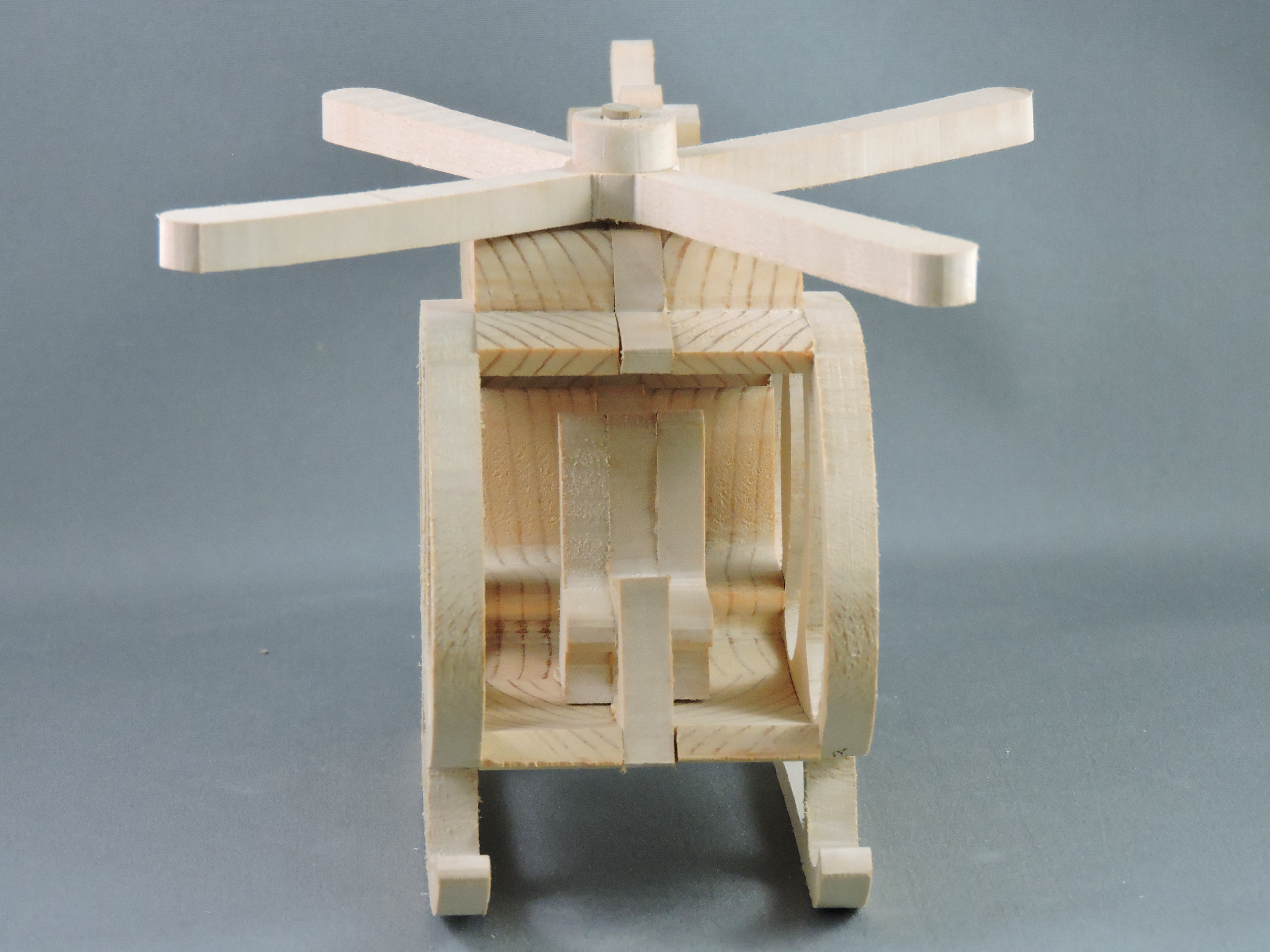 The cabin is formed from layered wooden pieces, creating a 3D silhouette with large cut-out openings for windows, doors, with seats and a control column. The landing gear feaures curved skids a the base of the aircraft for stability.