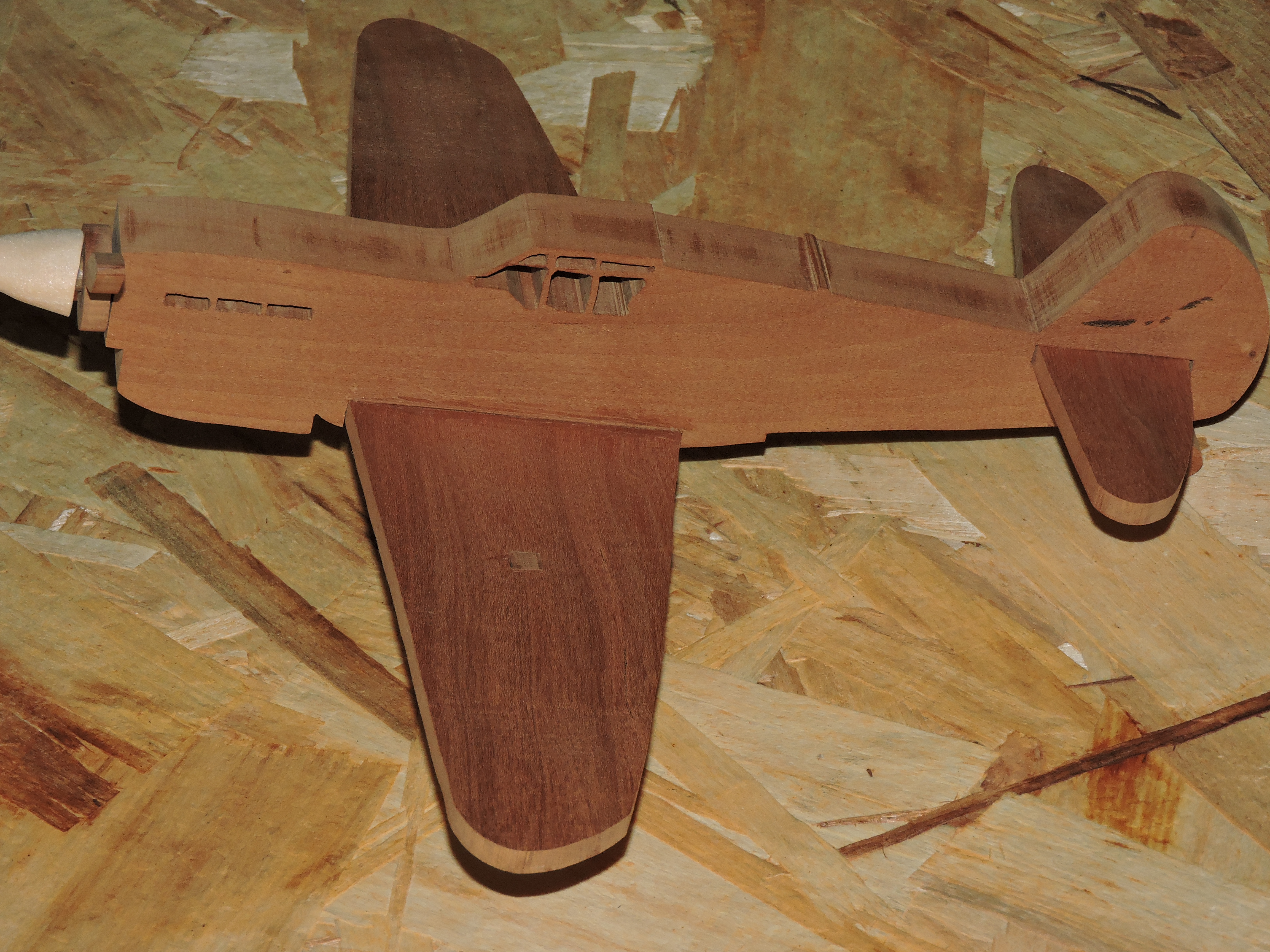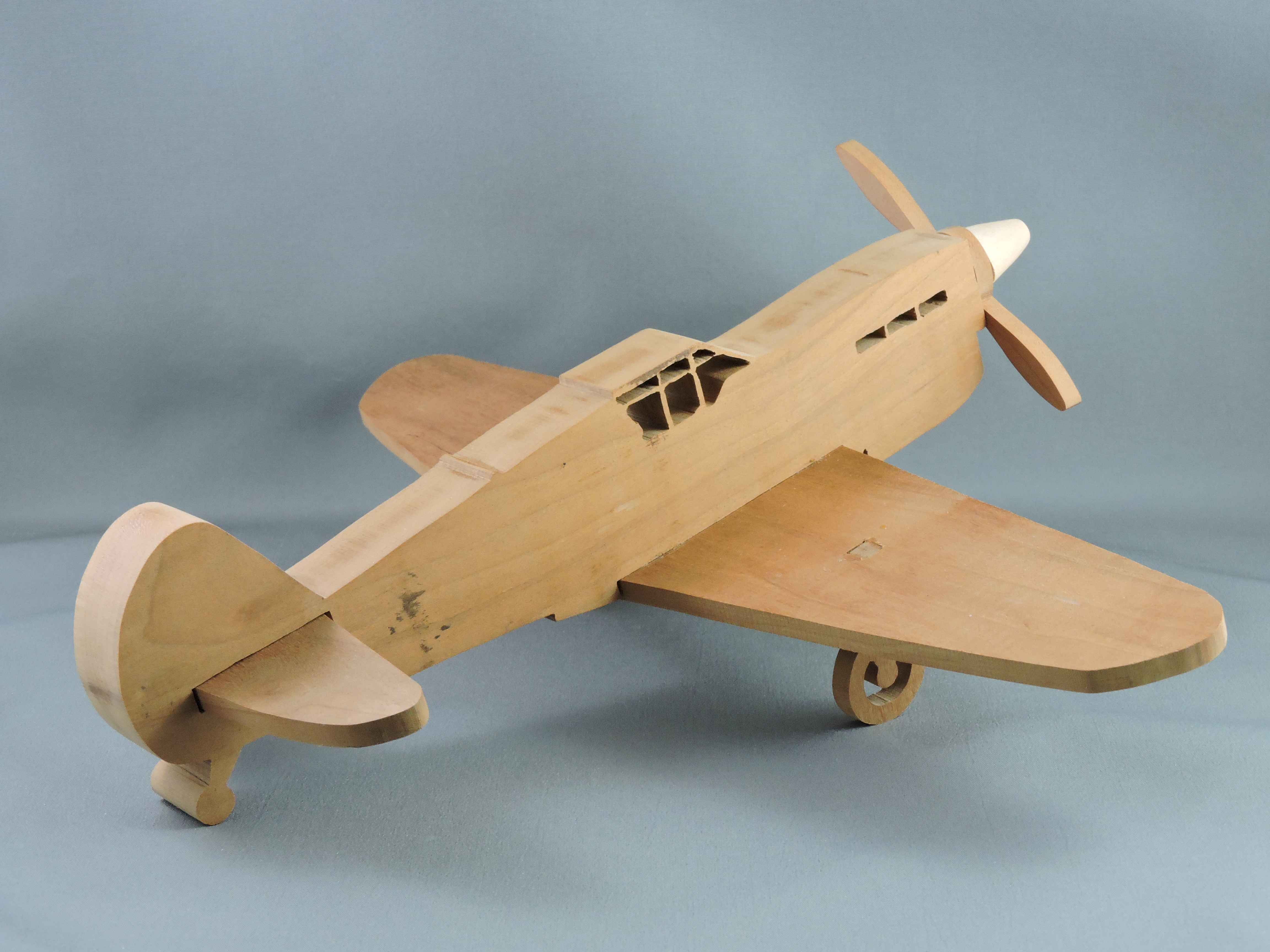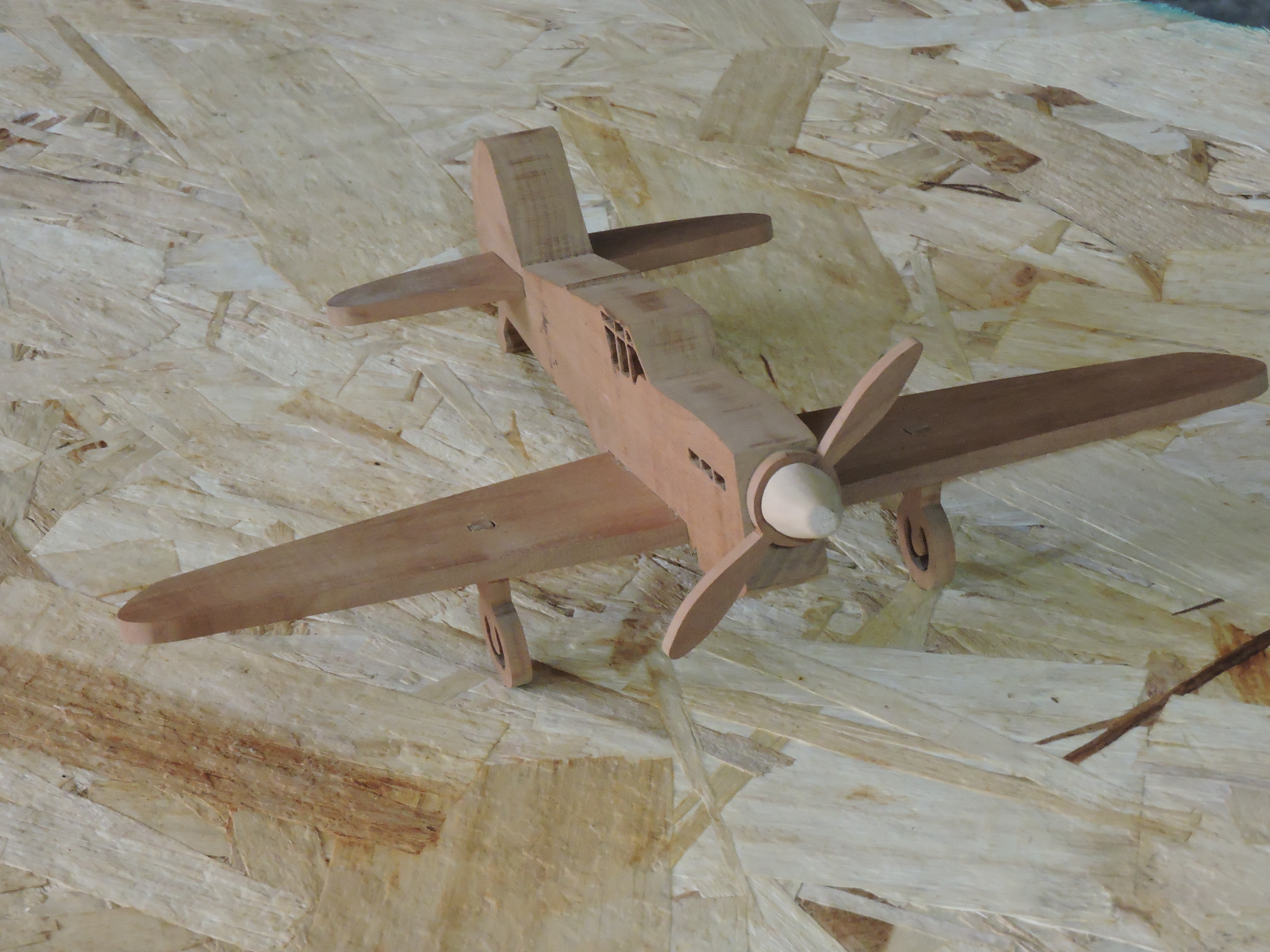 A handcrafted wooden toy airplane made from cherry wih a smooth unfinished surface. It feaures a single propeller wih two blades, a rounded nose cone, cut-out cockpit canopy with rectangular window openings, straight wings, a rear tail fin, and a fixed landing gear with circular wheels that have simple carved details. The overal design resembles a vintage fighter plane, like a WWII-era model. It is suitable as an ornament or a toy.