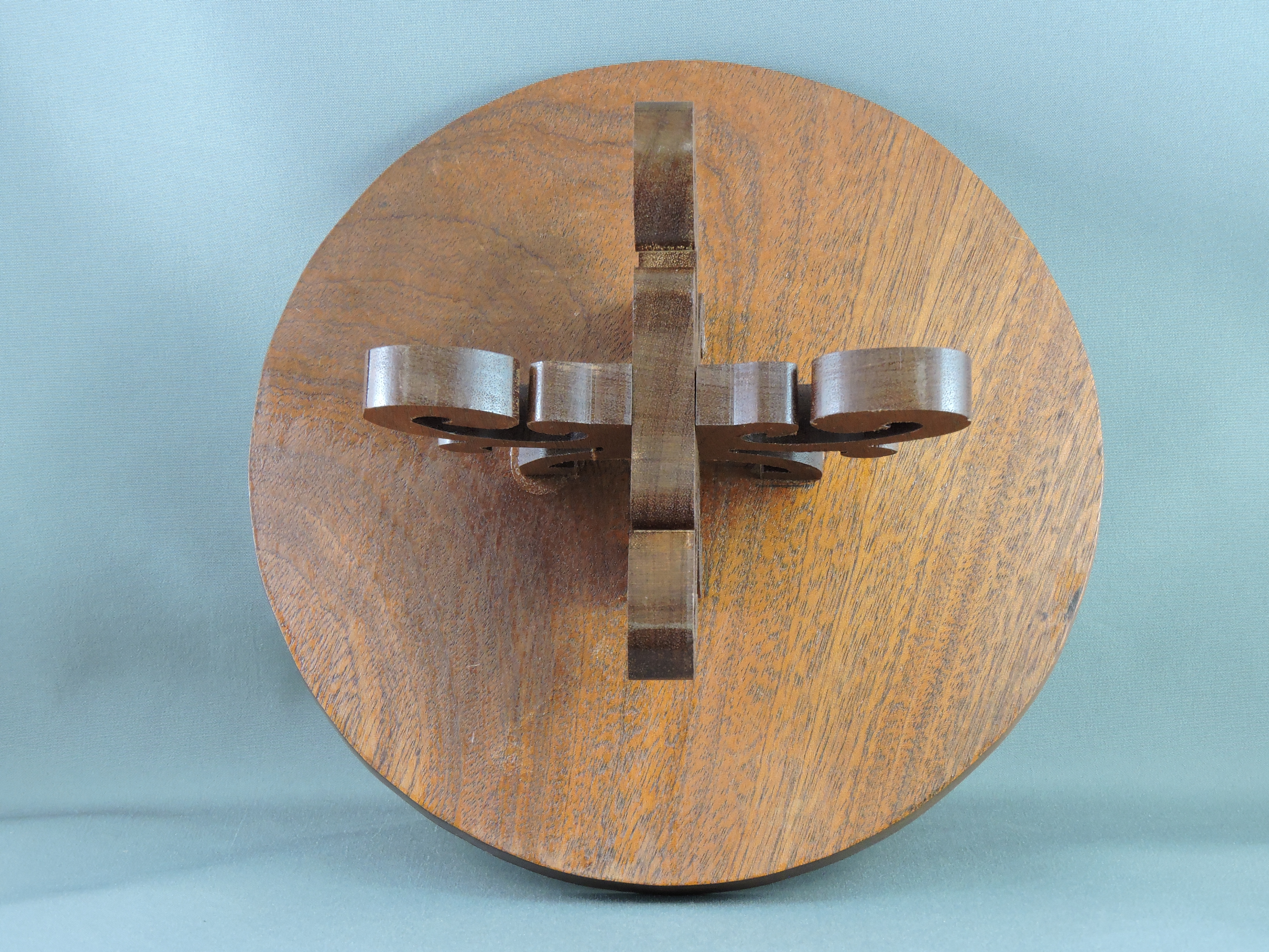 This lovely round cherry woooden stand has a smooth, dark finish. The stand has a flat top and is supported by three intricately carved legs that curve outward and upward, featuring a decorative design.